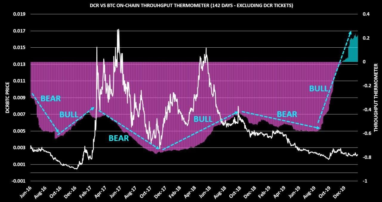 The Throughput Thermometer compares on-chain throughput between two assets (DCR and BTC in this case) and adjusts for outstanding supply to ensure an apples-to-apples comparison. This tool is best used to gauge macro bullishness or bearishness. When the thermometer is trending upwards, Decred on-chain flows are increasing versus Bitcoin flows pound-for-pound, which generally is paired with an uptrend DCR/BTC price (and vice-versa). The chart below shows that over the past 142 days, Decred has settled 20% more native units on-chain relative to Bitcoin when adjusted for supply - an all time high for the Decred network. Note, this data excludes ticket transactions and is specifically representing non-ticket DCR transactions relative to all BTC transactions.