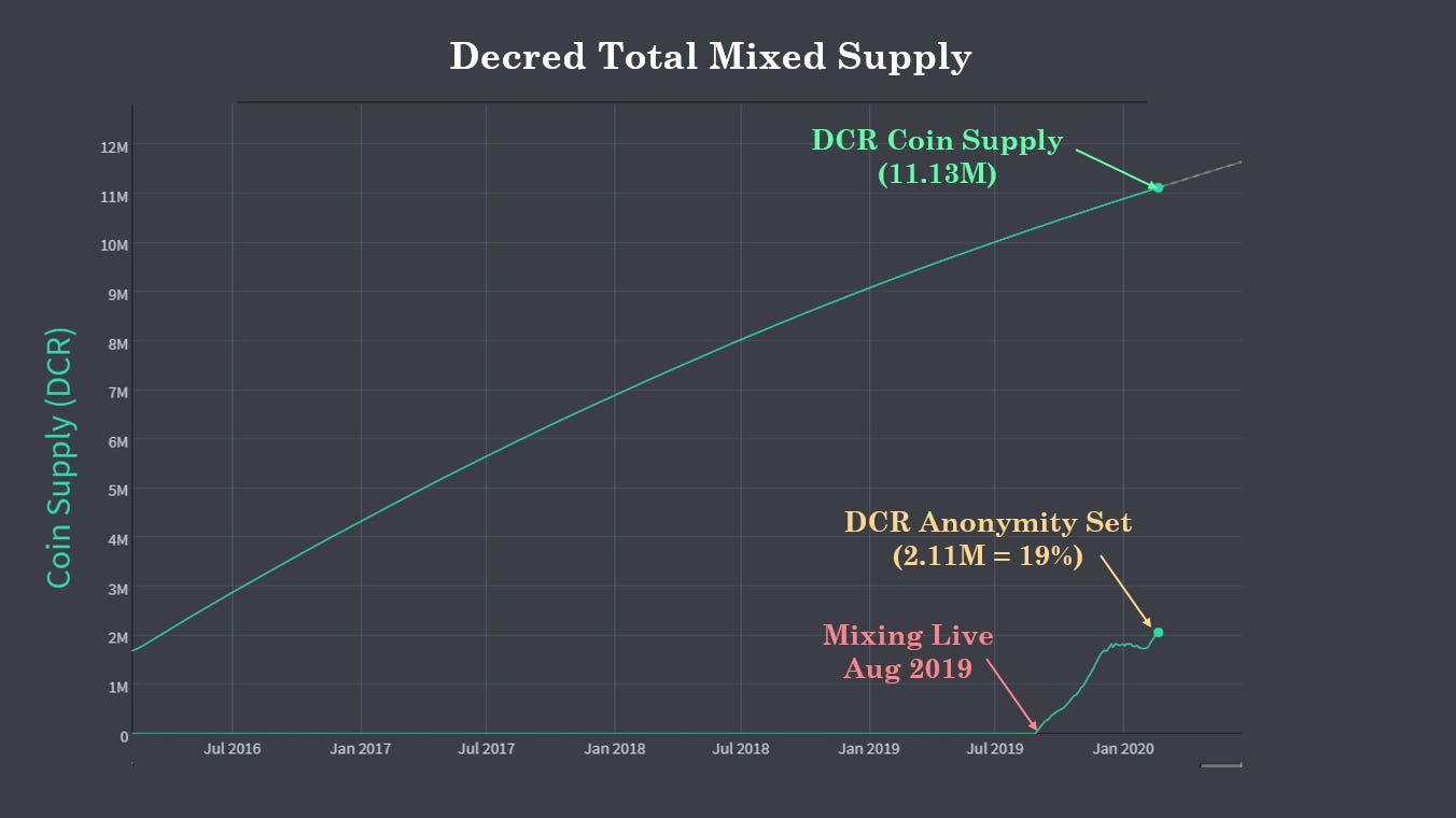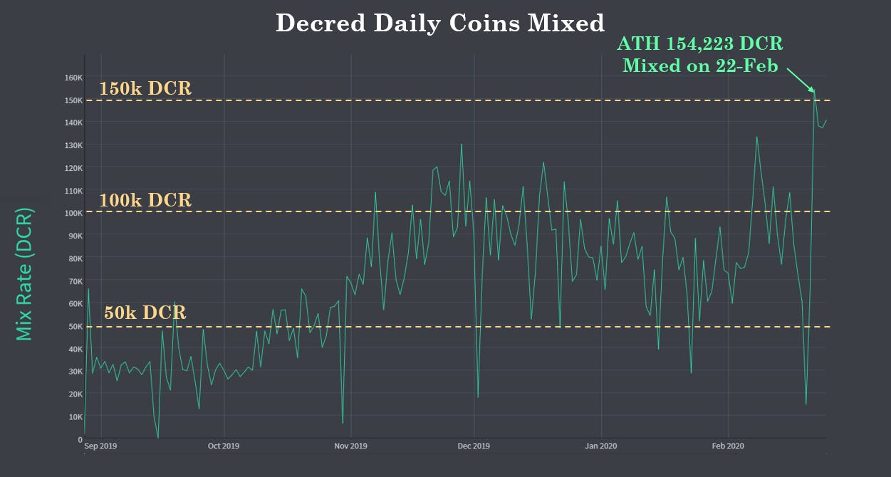 Current volumes passing through Decred coin-joins are consistently between 50,000 and 100,000 DCR per day. At recent prices of $20, the protocol is mixing between $1 to $2 Million in value per day. On the 22-Feb, a new all-time high was hit with 154,223 DCR in mixed volume, equivalent to over $3 Million. The fee for mixing is just a standard blockchain transaction fee for users, meaning each mix can be completed for a few cents.