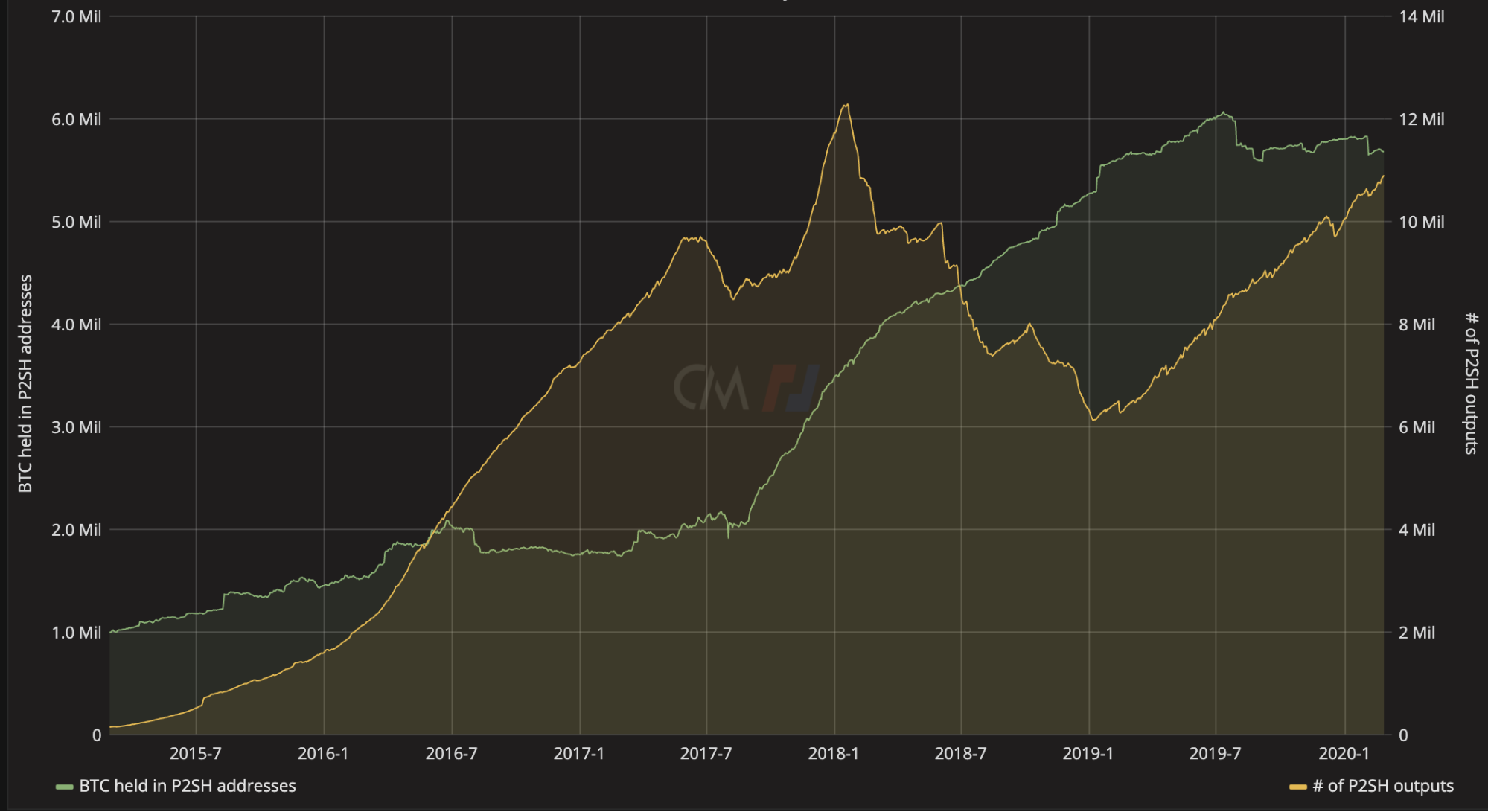 Usage of P2SH addresses has been steadily increasing over the last five years. Today, there is almost 5.68 million BTC held in P2SH addresses, close to the all-time high. Additionally, the number of P2SH outputs has been growing over the past year after peaking in early 2018. As of February 20th, there were about 10.9 million P2SH outputs.