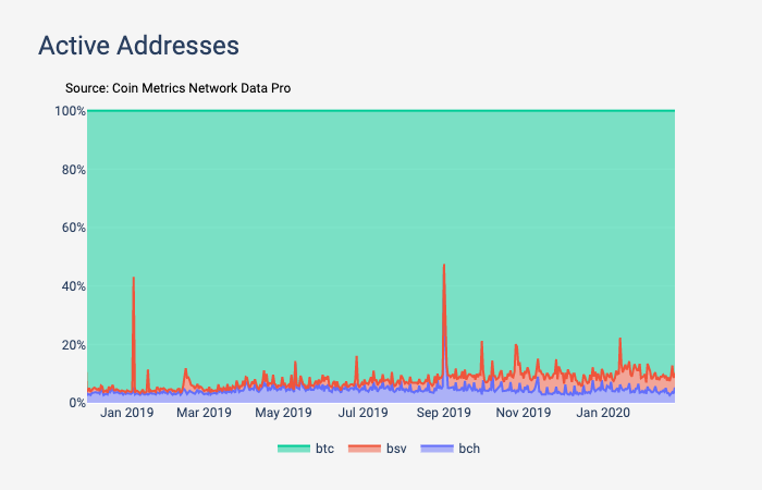 Similarly, most usage has remained on Bitcoin. As of February 25th, Bitcoin has about 90% of the combined total daily active addresses for the three chains.