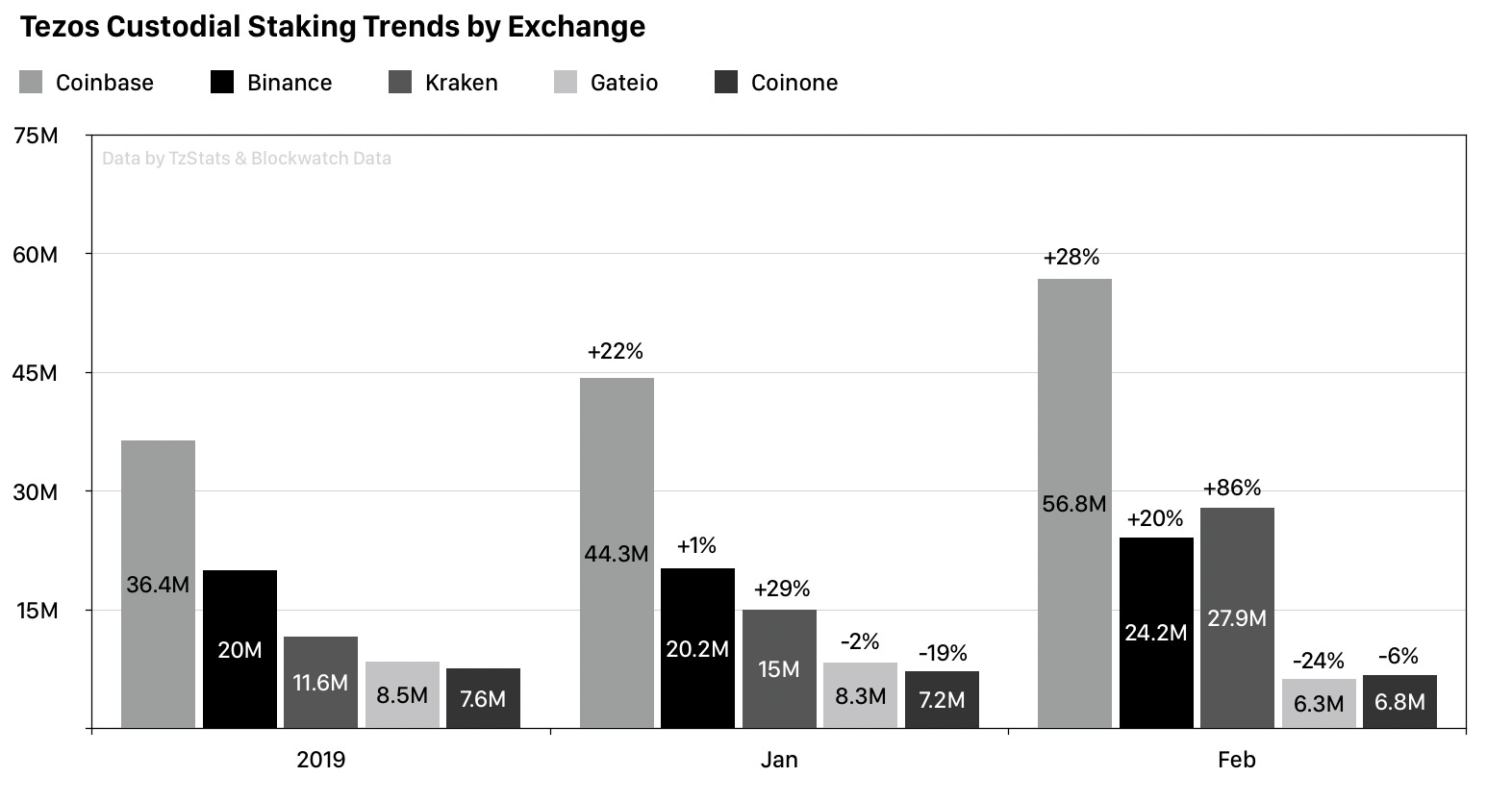Staking: Custodial staking on centralized exchanges continues to grow massively. Now, at the end of Feb 2020, 126.8M tez (19.4% of all staked coins, 15% of total supply) are held by custodians, up +27% (30.6M) from January. Network-wide staking is still on the rise with +3.2% (20M) to reach a new ATH of 79.14% (655M). In perspective, only 2.9M new tez were minted last month. Staking rewards are at 6.48% annually, yield above inflation dropped to 1.44%.
