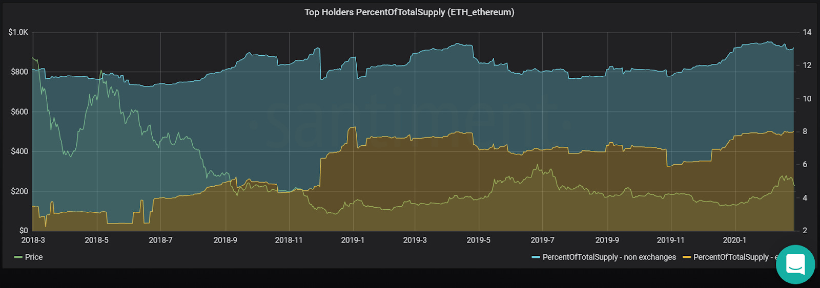 A great way to understand the “wealth gap” between top holders and the rest of the investors of Ethereum is to look at what percentage of ETH’s total supply is presently concentrated in 10 of its biggest addresses. On Sandata, we’re noticing that the network’s biggest ‘whales’ are still on the cusp of a 2-year high in terms of their share of Ethereum’s total supply, currently holding 13.15% of all ETH tokens.