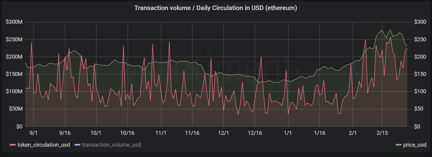 Amount of unique ETH transferred on the network improves in February. Ethereum’s token circulation, or the amount of unique ETH coins involved in transactions over the last month indicates an uptick in total value transferred on the network compared to the start of the year.