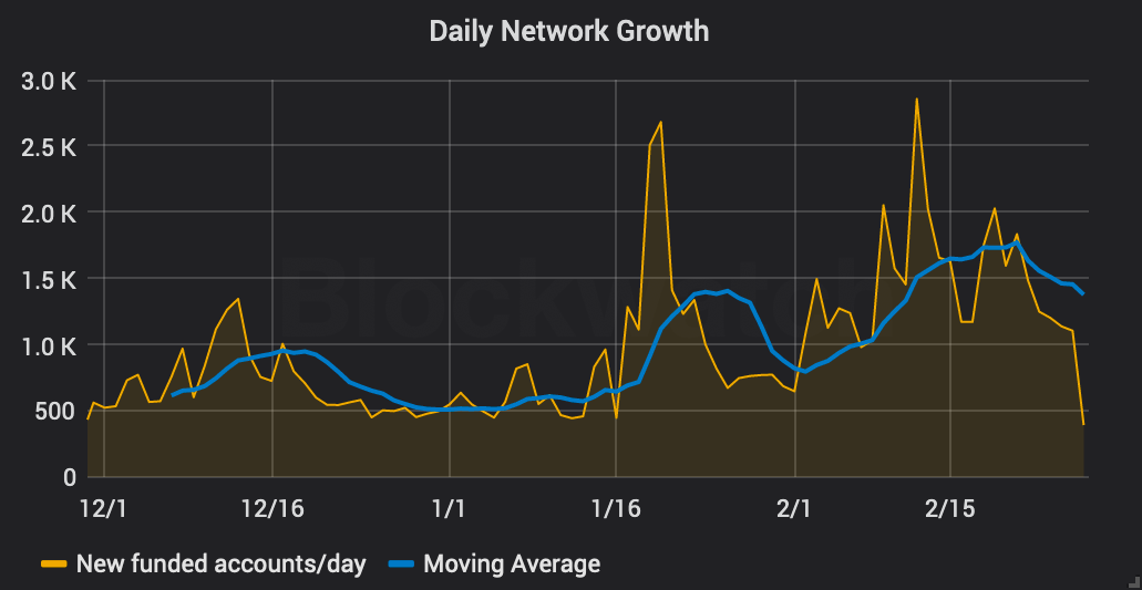 In USD, the total amount of transactions that took place on Ethereum in January carried a cumulative value of ~$3.39B. At the time of this writing, through February 26th, $2.85B of transactions have occurred for a projected 31-day rate (to provide an equal comparison to January) of $3.43B.