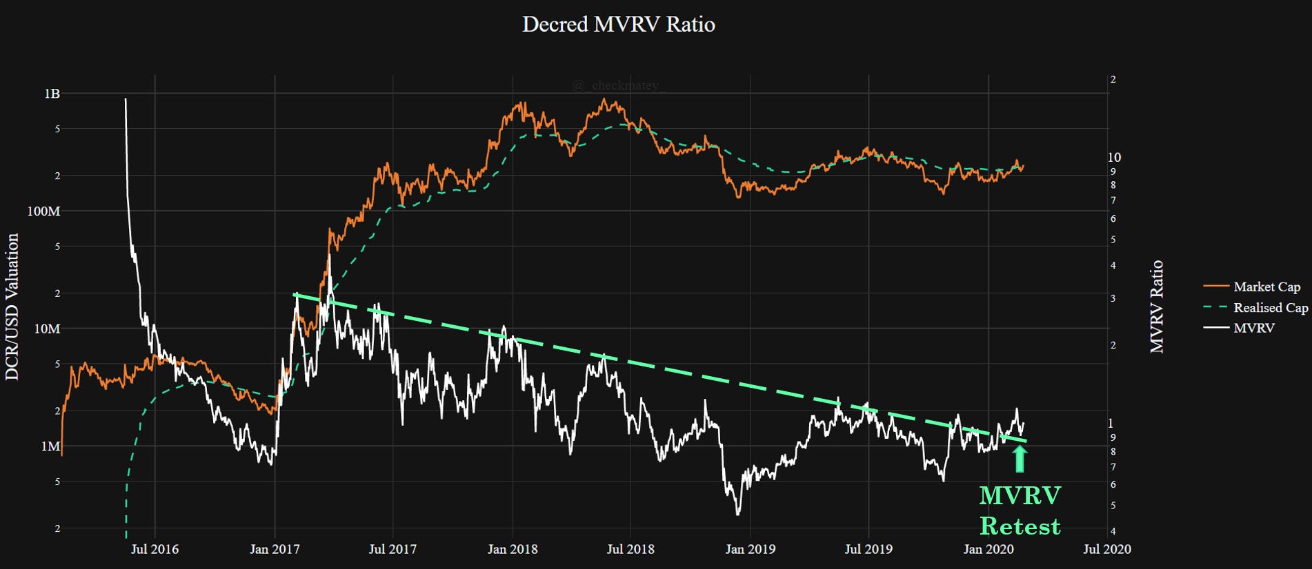 The Decred MVRV Ratio shows the relationship (ratio) between the Market Cap and the Realised Cap. Since DCR is always moving on-chain in tickets, the Realised Cap tends to act as support in Bullish markets and resistance in Bear markets. Note, the Realised Cap is a sum of all UTXOs priced at the time they were last spent. The DCR Market Cap has recently broken above the Realised Cap and the MVRV Ratio is retesting support on the trend-line which has contained it since mid 2017. The author expects the MVRV to act as an oscillator in response to Bull/Bear cycles.