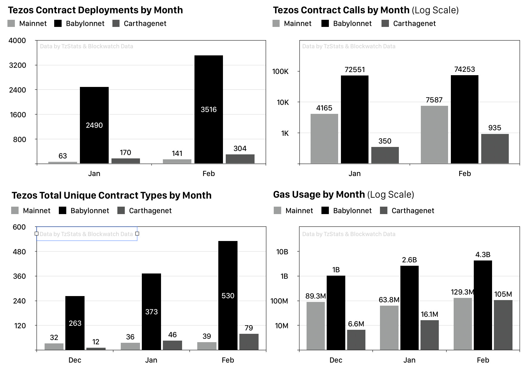 Adoption: Testnets still outshine the smart contract situation on Tezos Mainnet. Calls on Mainnet have almost doubled compared to January (+7,587), the Atomex DEX saw some limited traffic (33 swaps) and early experiments with FA1.2 tokens have started. Babylonnet remains the most active network with a new record of +3,516 contracts and +74k calls this month, but note that these are all test contracts, often deployed and called by automated CI systems. The diversity of unique contract types (identified by their call interfaces) grew by +157 to 530 in total. 8 out of the top 10 contract types are generic programming examples. The most prominent contract people work on is DS Token (used by Securitize and Elevated Returns) with 111 total deployments and 6,652 calls in Feburary.