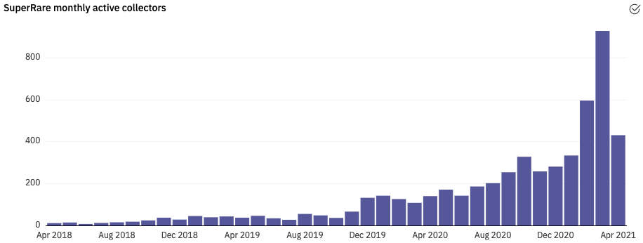 Monthly active collectors reached an all-time high in March. SuperRare focuses on authentic crypto-native artists that collectors will repeatedly support and avoids getting big-name artists to do a one-off cash grab NFT drop, as those NFTs are now trading well below their primary sale price on secondary markets.