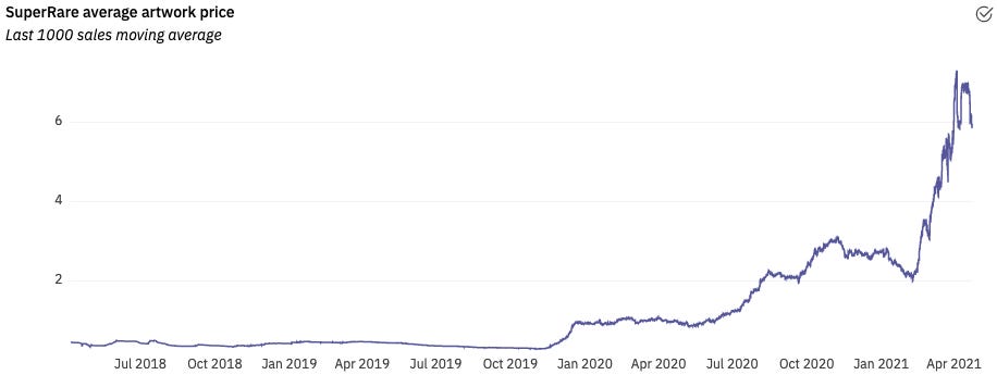 SuperRare differs from other platforms by being the only place for curated 1-of-1 cryptoart. As a result, pieces sell for much more on SuperRare than all other platforms as collectors will pay a premium for a "super rare" minted NFT. The average artwork price on SuperRare reached a high of 7.28 ETH.