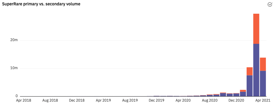 SuperRare monthly volume reached an all-time high of $30M in March. The company made $3.7M in revenue and artists made over $1M in secondary royalties in March. A sizable portion of the volume was driven by secondary sales as the floor price for blue-chip artists like Pak, XCOPY, Hackatao, Frenetik Void, Coldie, and others was raised significantly. Several record sales include "Death Dip" by XCOPY (1000 ETH) and "DΞSTINATION HΞXAGONIA" by Don Diablo (600 ETH).