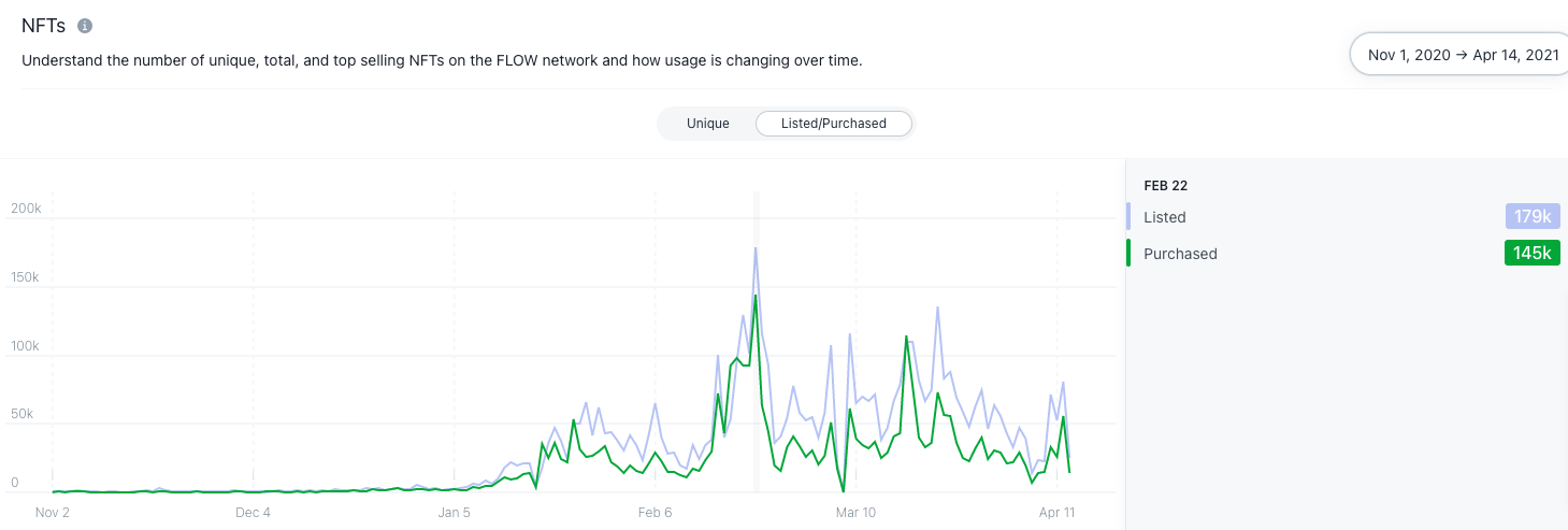 Flow reached a peak of 179k NFTs listed on February 22nd, right around the time a Lebron James highlight sold for an unprecedented $200,000.