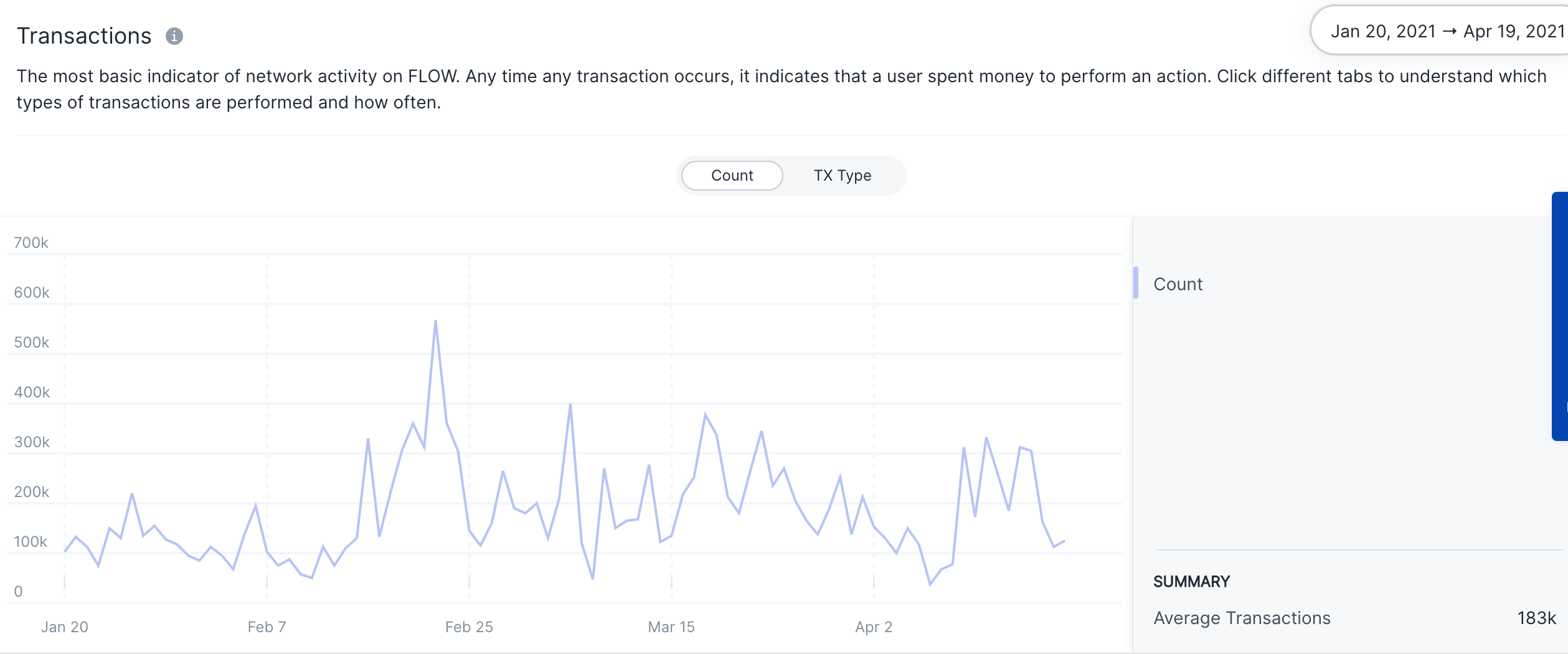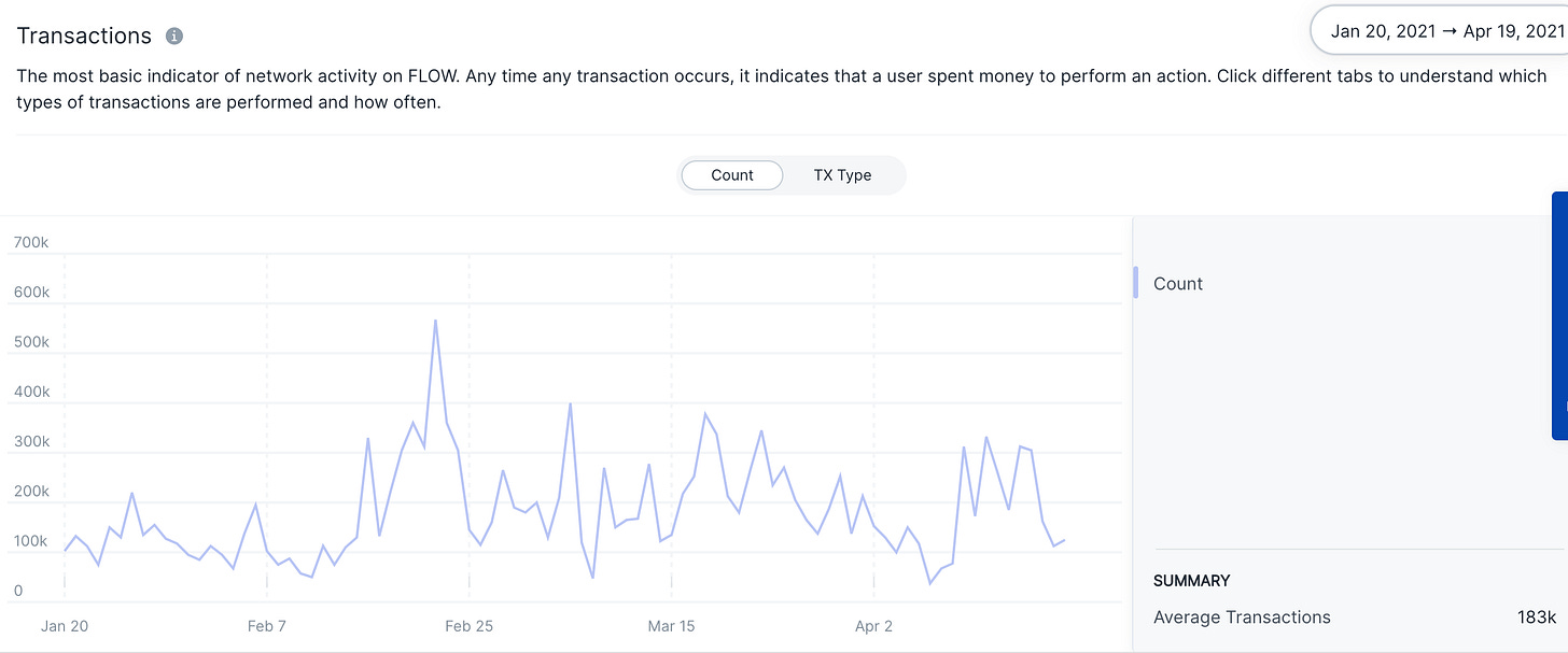 Flow sees an average of 183k transactions daily. The fact that this has kept steady over time is a good indicator of ecosystem health.