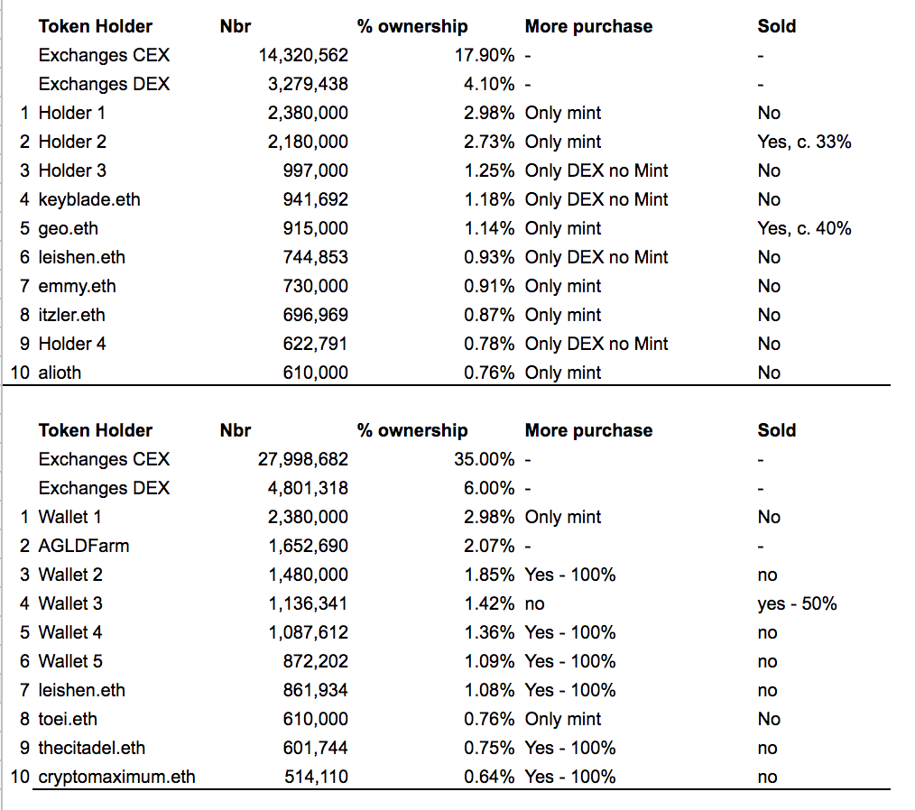(AGLD, continued) In just a week, the top 10 holders of AGLDÂ changed quickly. At first all top holders minted tokens. A week later, only one of the the top wallets remains in the top ten and only two receive from the minting. This rapid change in top holders cements the fact that the community is still emerging.
