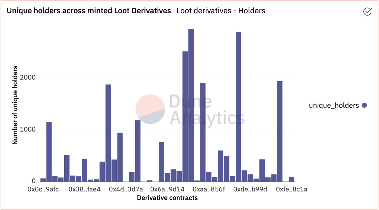 Assuming the current number of unique owners of Loot is around 2.5k, early derivatives have enjoyed more participation than older ones. Some of them with the most mints include Abstract Loot, Characters, Treasures, and Realms with an exception for Doggos for Dog Owners which was announced a few days later.