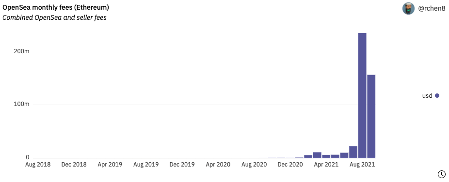 OpenSea earned $236M in fees in August. The fees included both the OpenSea marketplace fee (2.5% of GMV) and seller commission fees. Thus, the take rate for OpenSea was $85.6M in August, giving an annual run rate of $1.027B and a P/E ratio of 1.46!