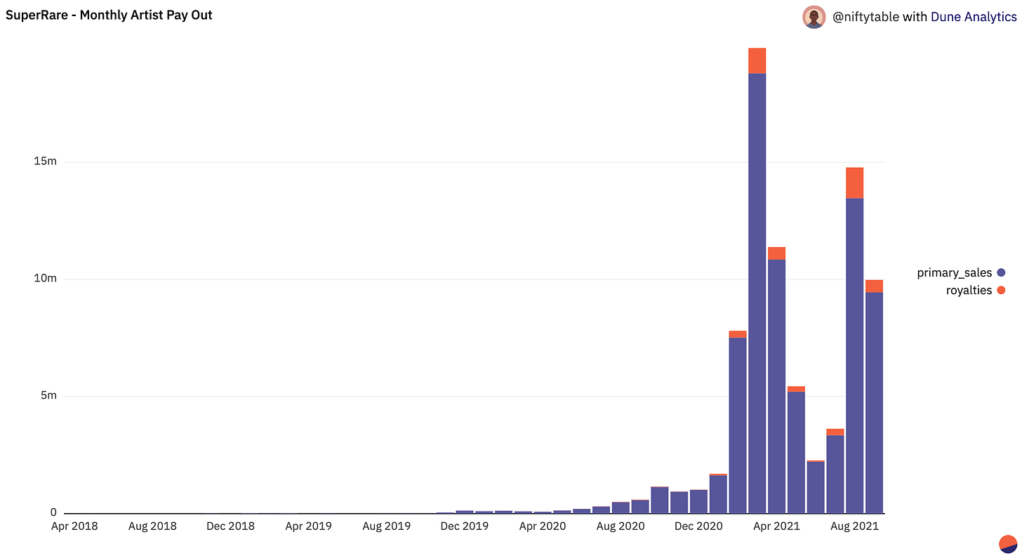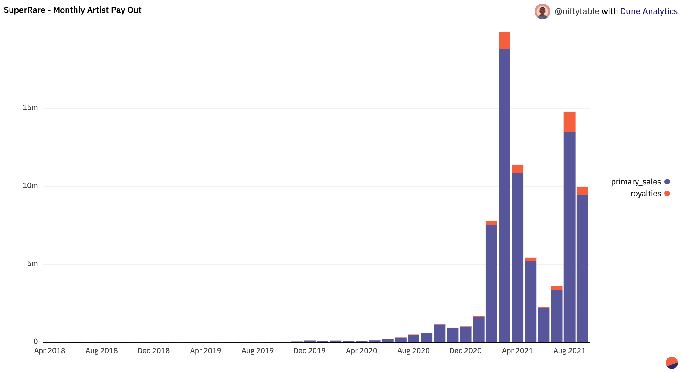 SuperRare is the leading curated marketplace for 1/1 NFT art. In August, $14.8M was paid out to the 1,556 artists on the platform. $13.5M was the result of primary sales of the NFTs from artists to collectors. $1.3M was secondary sale royalties. Every time one collector sells an NFT to another, the original artist gets a 10% royalty cut of the transaction.