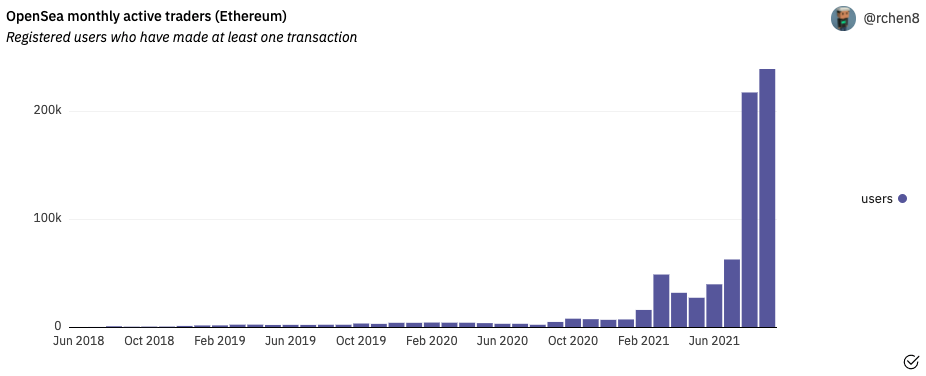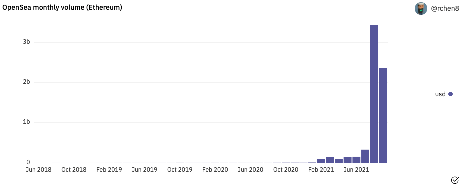 OpenSea had a record August with $3.4B in gross merchandise volume (GMV)! OpenSea even did more volume than Etsy and most publicly traded marketplace companies. The NFT explosion the past month was driven by new avatar projects and generative art. OpenSea's search and discovery infrastructure, especially custom integrations for filtering a project's NFTs by attributes, made it the leading platform for buying NFTs.