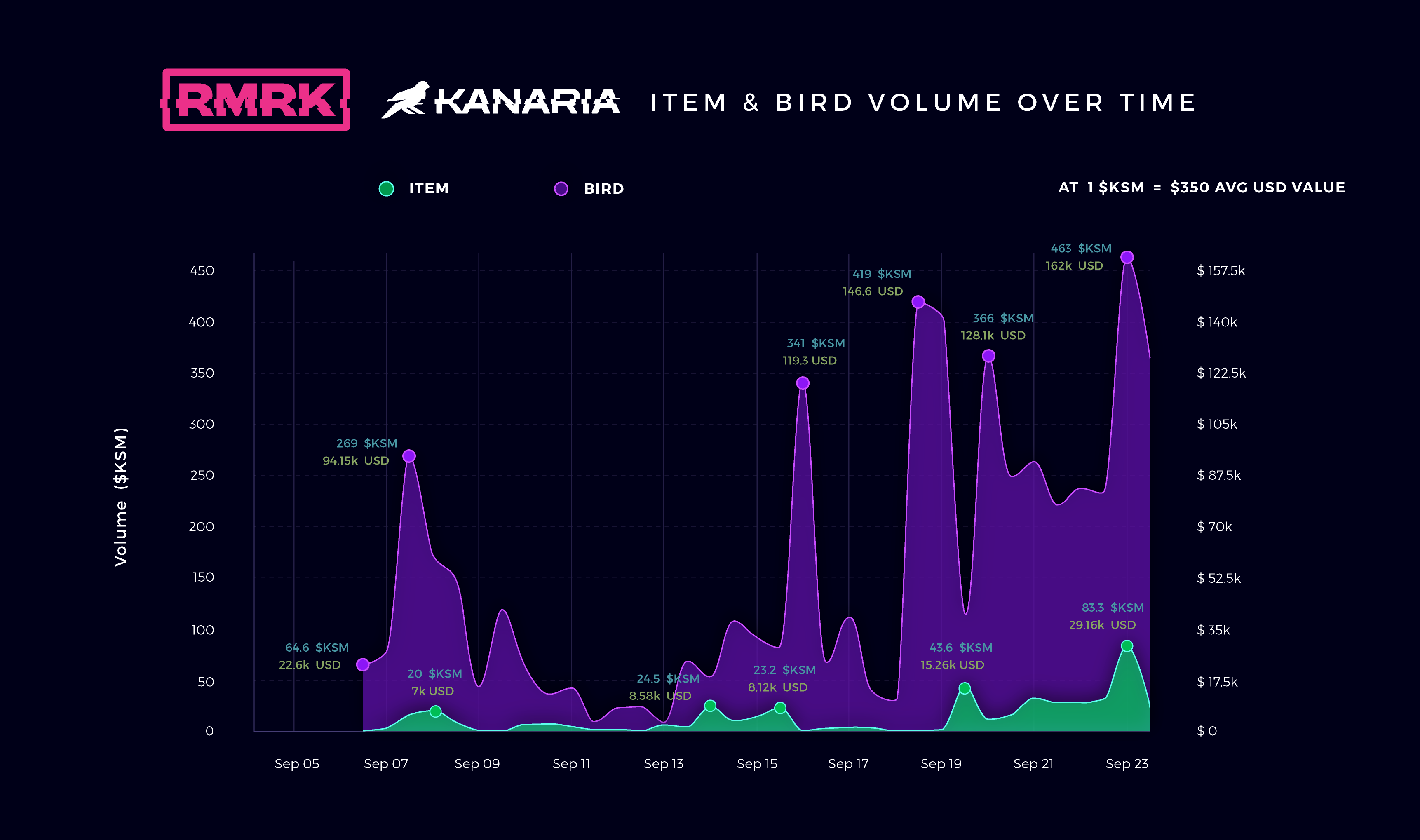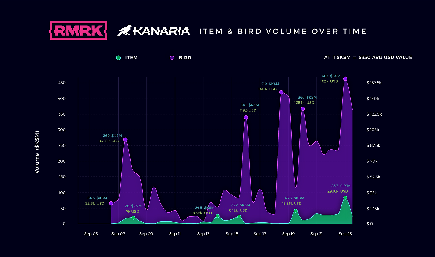Kusama Network's RMRK.app protocol is a set of NFT legos. When put together with no additional chain-side code, RMRK primitives allow the creation of a multi-chain forward-compatible NFT system of arbitrary complexity. RMRK's inaugural project and product demo, Kanaria - NFTs that can equip other, standalone NFTs - launched in August 2021. Since trading was allowed on September 5th, Kanaria's ecosystem alone has seen over 2.2M USD in volume, some in equippable NFTs, but the majority in bird volume.