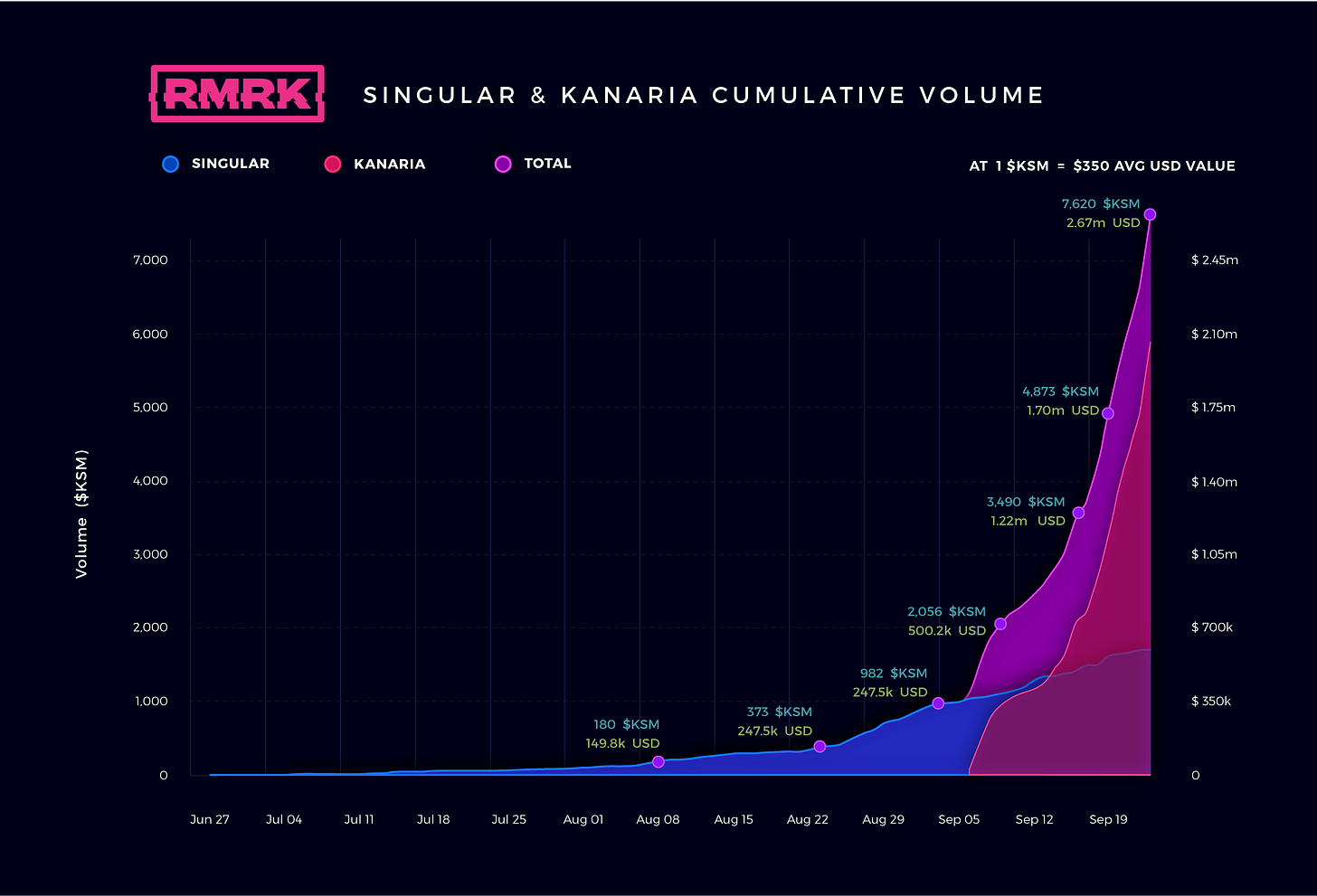 RMRK also runs the Singular.rmrk.app NFT marketplace for simple, Ethereum-like NFTs that will be upgraded to Kanaria's tech soon. This marketplace has had about half the volume of Kanaria, bringing the total just over to 3M USD - a new and active NFT ecosystem in the making.