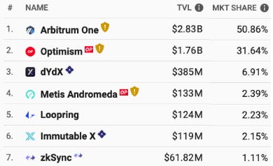 Arbitrum is a leading scaling solution for Ethereum. Its products consist of Arbitrum One, an optimistic rollup solution, as well as Arbitrum Nova, the recently launched platform for social and gaming use cases. Arbitrum has drawn the attention of major institutions such as Reddit, which chose Arbitrum Nova for its community points initiative, and the Norwegian Government, which recently announced a new cap table platform built on Arbitrum. To date, Arbitrum controls over 50% of all TVL on Ethereum L2s.
