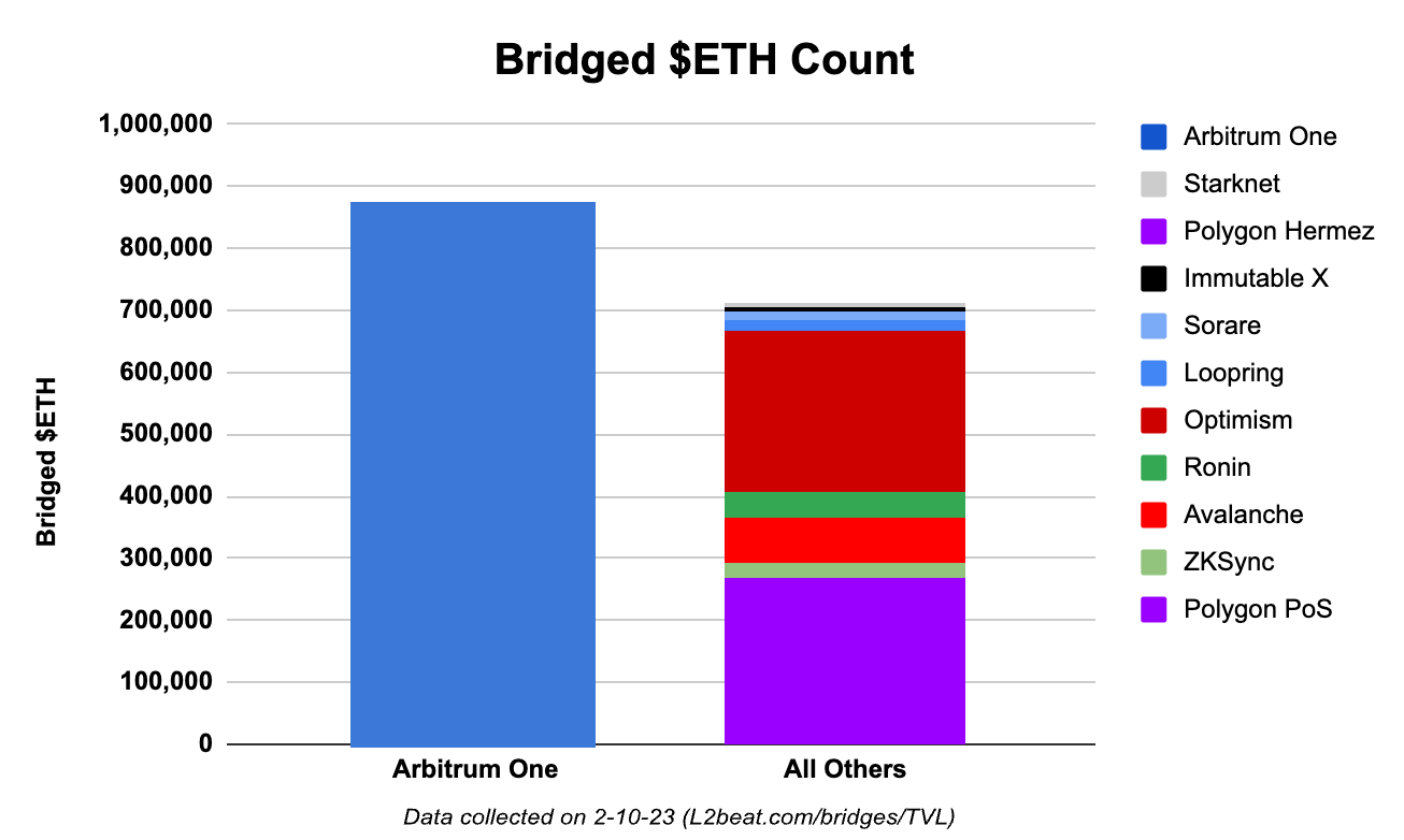 In addition to transaction volumes, the amount of liquidity on Arbitrum is continuing to increase as well. Arbitrum One is currently the leading bridge from Ethereum into other execution environments. There is currently 870k+ ETH bridged into Arbitrum, which is more than all other major scaling solutions combined. DeFi TVL has also grown 39% over the past month and DEX volumes 46% over the previous week.