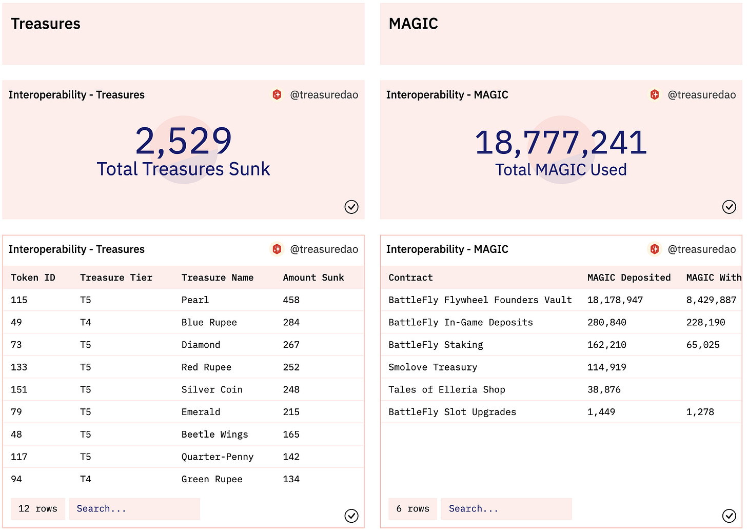 Interoperability sits at the very core of Treasure. Over time, games powered by Treasure have incorporated sinks for $MAGIC and Treasures (NFTs) with 18.8m MAGIC and 2.5k Treasures used and deposited across different games in the ecosystem, with more planned uses to come.