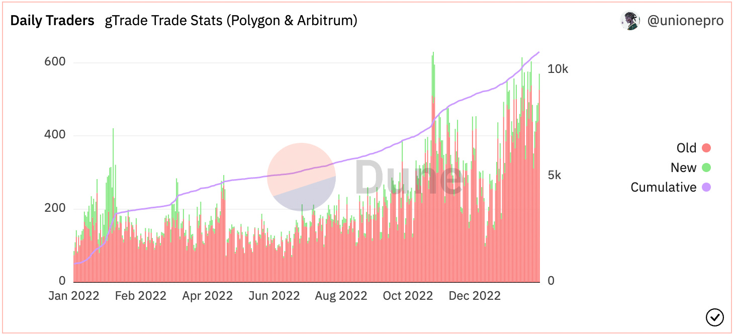 To kick off 2023, gTrade became a multi-chain platform with its Arbitrum launch. The expansion to Arbitrum played a big role in gTrade welcoming 1,433 new traders in the past 30 days. With 10,886 all-time traders, this means gTrade increased total users by over 15% in just the past month.