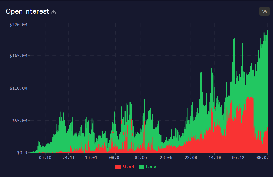Open Interest has continued to increase, tracking ~$220m. The developers contributing to the protocol have been working on GMX V2 for the last year, which will allow for the trading of many different assets.