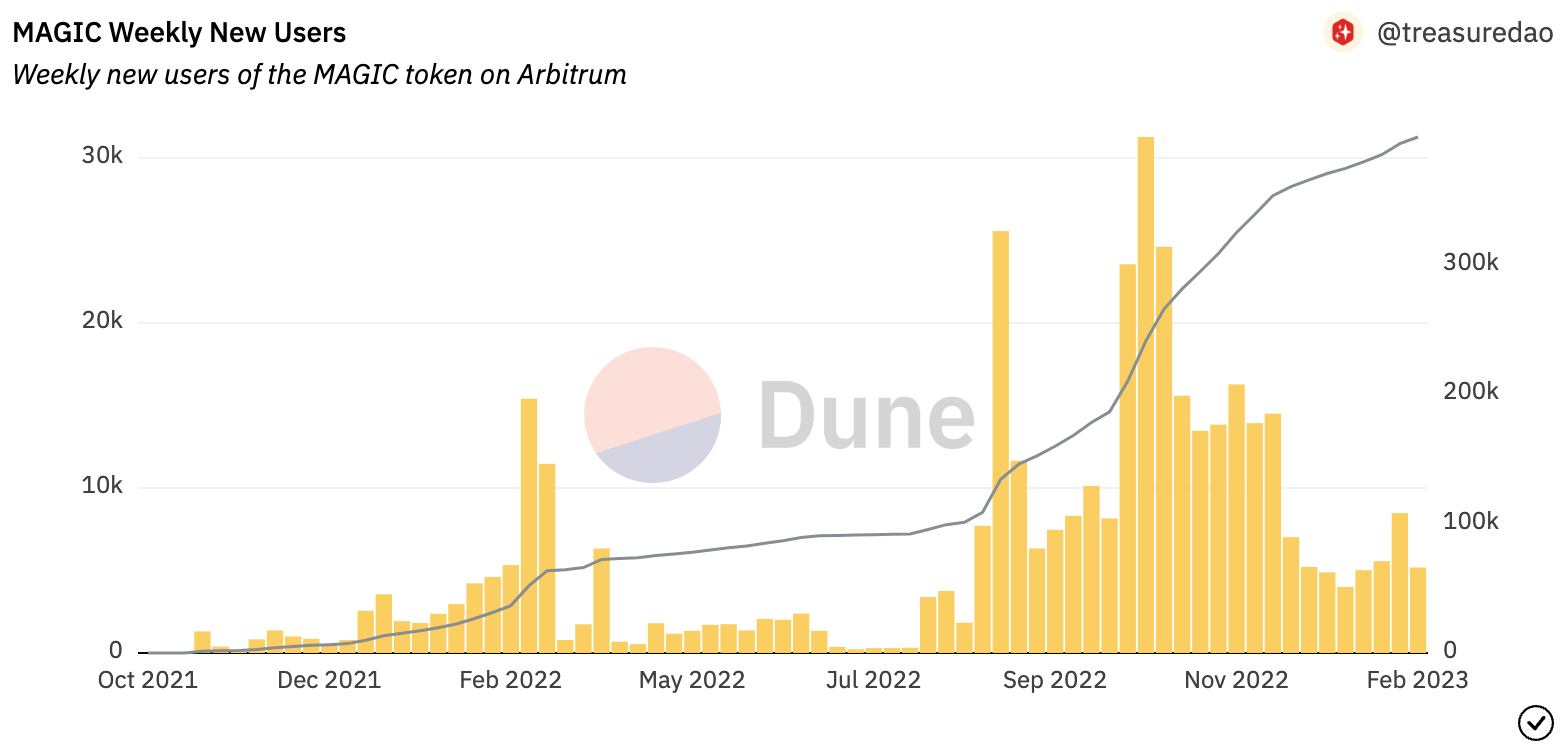 Since its launch in September of 2021, the number of unique holders of Treasure’s ecosystem token, $MAGIC, has grown to over 317k. With $MAGIC available on the world’s leading exchanges (Coinbase and Binance) as of December of 2022, and its games acquiring new player audiences, $MAGIC adoption continues to rise.