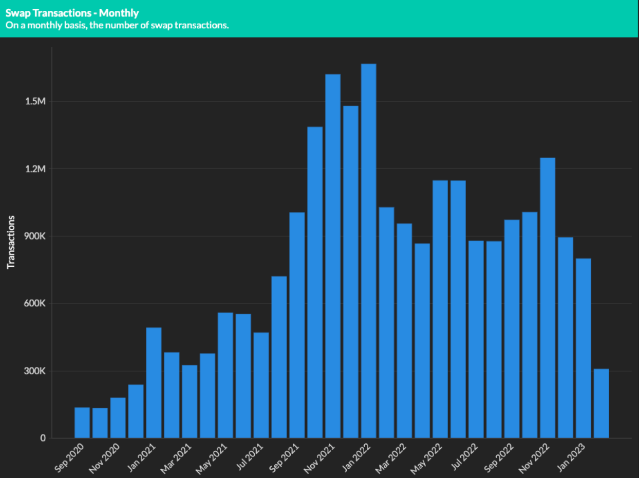 Sushi is a cross-chain AMM-based DEX, originally a fork of Uniswap V2. The project has grown to become the 4th largest DEX by both TVL and volume, supporting over $298b in trade volume across 20+ different blockchains. Despite a cooling market for crypto, Sushi managed to grow the overall number of transactions by 34.12% during 2022; however, this growth was stunted by the fall in token valuations, which resulted in lower trade volumes over the same period.
