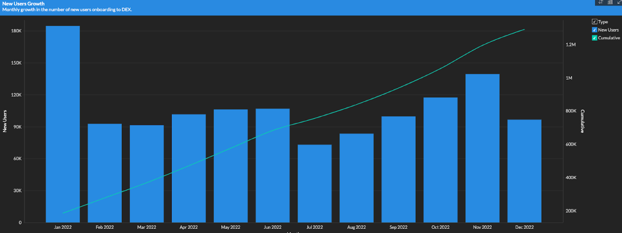 Throughout 2022, Sushi had 1.3m unique users making transactions on our DEX, a 9.2% increase YoY. Starting in early fall, there was explosive growth in new users coming to Sushi via the Arbitrum ecosystem, while the number of mainnet ETH users plateaued.