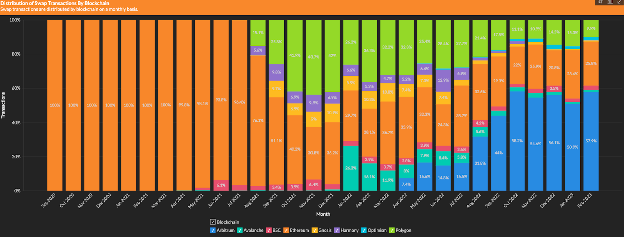 Sushi was one of the first DEX’s to launch beyond Ethereum mainnet and currently supports trading across 20+ different blockchains. An increasing number of trades happening on Sushi are taking place on major L2 protocols, particularly Arbitrum which accounts for more than 50% of monthly swaps and 37.9% of overall dollar volumes as of writing.