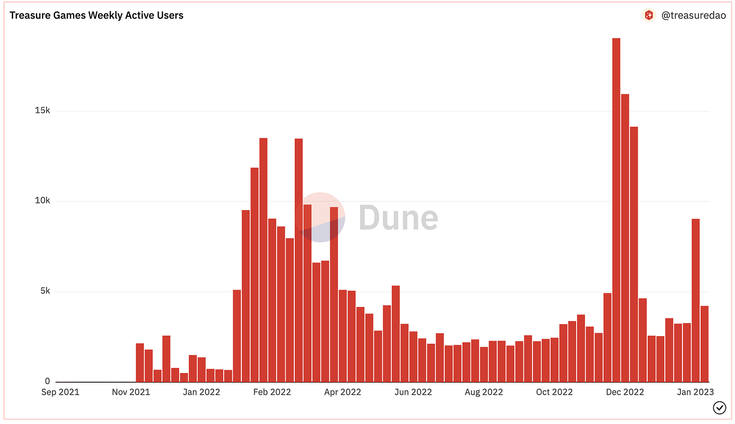 Treasure is building the “decentralized Nintendo,” a game publisher connecting games and players together through shared experiences, resources ($MAGIC), and infrastructure (e.g. Trove marketplace, MagicSwap AMM, other game dev solutions). Treasure’s gaming ecosystem has continued to see steady growth in weekly active users - 6k average over the past 2 weeks. Games includes The Beacon, Bridgeworld, and BattleFly, with other announced games (Kuroro Beasts and Bitmates) coming soon.