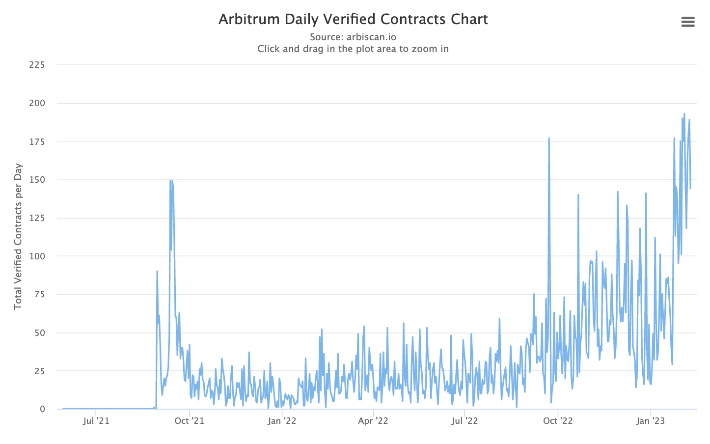 Finally, this increase in traffic and economic activity from users has caught the attention of developers. Over the last quarter, Arbitrum has seen verified contracts grow by more than 50% month over month.