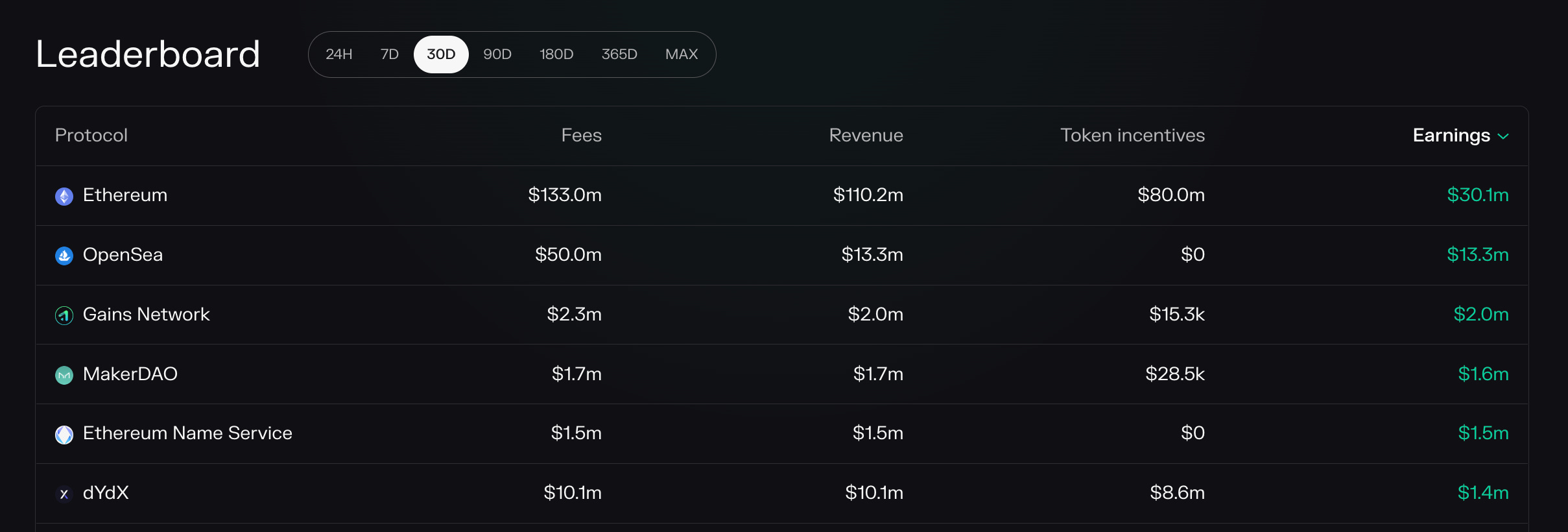 gTrade is an oracle-based, decentralized leveraged trading platform offering users exposure to 75+ trading pairs across crypto, stocks, forex, indices, and commodities. Gains Network (gTrade) has totaled $2m in past-month earnings to place third (only behind Ethereum and OpenSea) on Token Terminal’s 30D earnings leaderboard. With only $15.3k in token incentives over this 30D period, over 99% of gTrade’s protocol revenue translates directly to earnings.