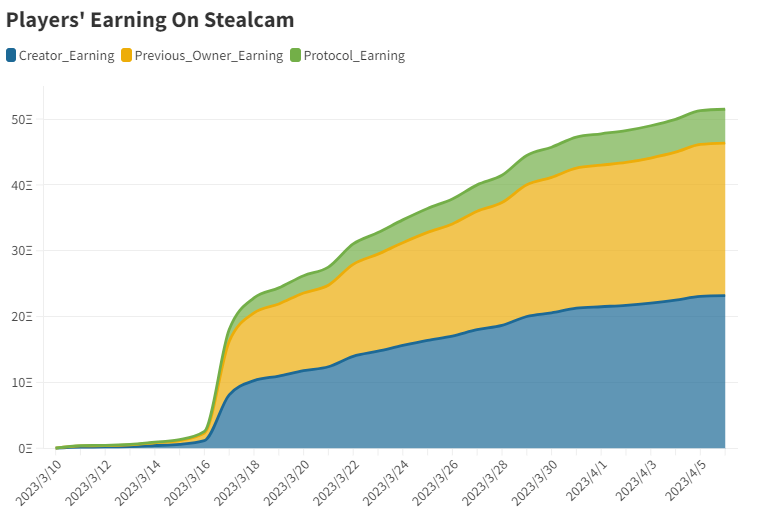Each time a memory is stolen, its price increases by 0.001 ETH + 10% of previous price. The premium is split among previous owner, creator, and protocol by 45%, 45%, and 10%, respectively. Creators have earned 23.2 ETH on Stealcam so far, and the platform has also accumulated 5.2 ETH in revenue.