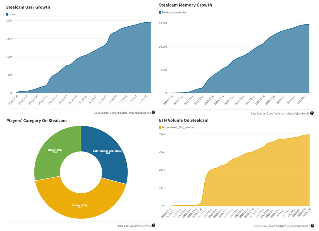 Stealcam is a mobile camera web app that allows users to create photos as memory NFTs on Arbitrum. Photos are pixelated by default, only their owners can reveal the memory. Users can “steal to reveal” memories from friends or creators, as well as earn ETH when an NFT is stolen. Since the launch on March 10th, 14.7K photos have been uploaded by 2K users. 72% of users have created memories, while 57% have stolen memories and 29% have done both. The “peek to earn” social game has captured 400 ETH volume, making it one of the most popular projects on Arbitrum.