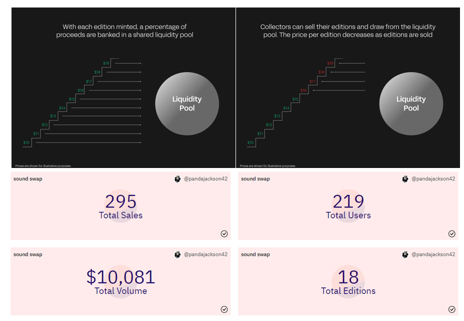 Sound Swap, its latest product launch, allows users to mint additional NFTs on a bonding curve after the initial sale. One-click collection and selling of editions is possible through Sound Swap. 219 users have completed 295 trades on 18 editions, totaling a trading volume of $10K.