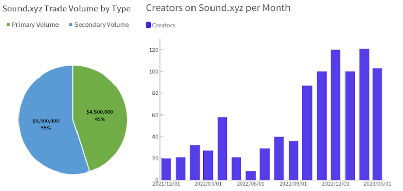 Sound.xyz enables music artists to launch music NFTs, while fans can support them. Artists can control their NFT collections and release songs with varying edition counts. As of April 4th, 1,370 unique music editions have been minted. Trading volume stands at $10M, with $4.5M from primary sales and $5.5M from secondary sales. Sound has helped 416 creators in creating and distributing their music, reaching a total of 15.8K collectors.