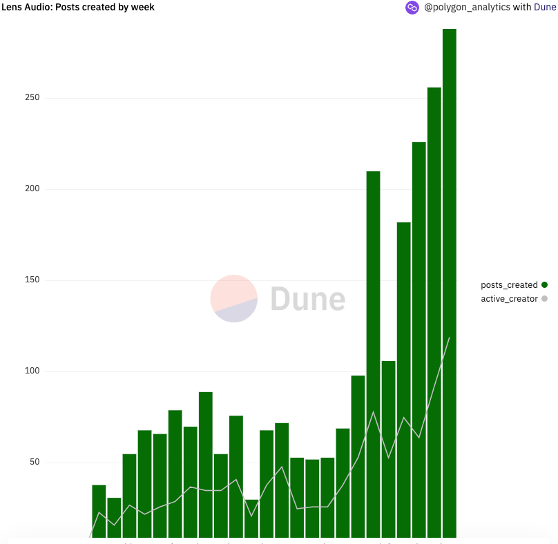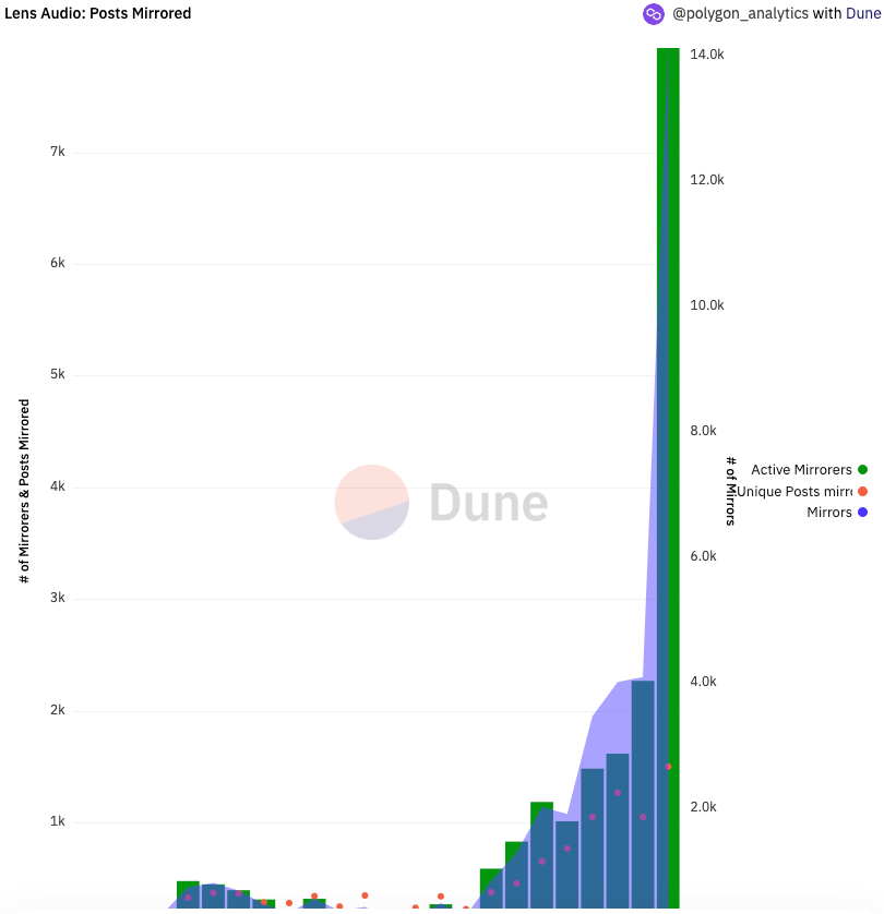 In addition to seeing an all-time high record of Lens collections and collectors, Web3 music space saw an increase of 249% in active profiles that had mirrored (the same as retweeting/sharing) compared to last week.