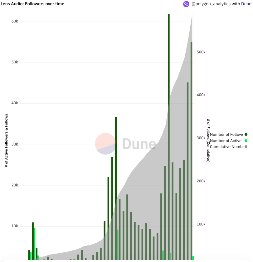 Finally, 588K follows have been made in Polygon's music space with an increasing number of follows and followers for the past 5 consecutive weeks. There was also a 260% increase in active followers over the past 2 weeks. Check out the amount of engagement that @Riffappxyz is driving in the Web3 music space.