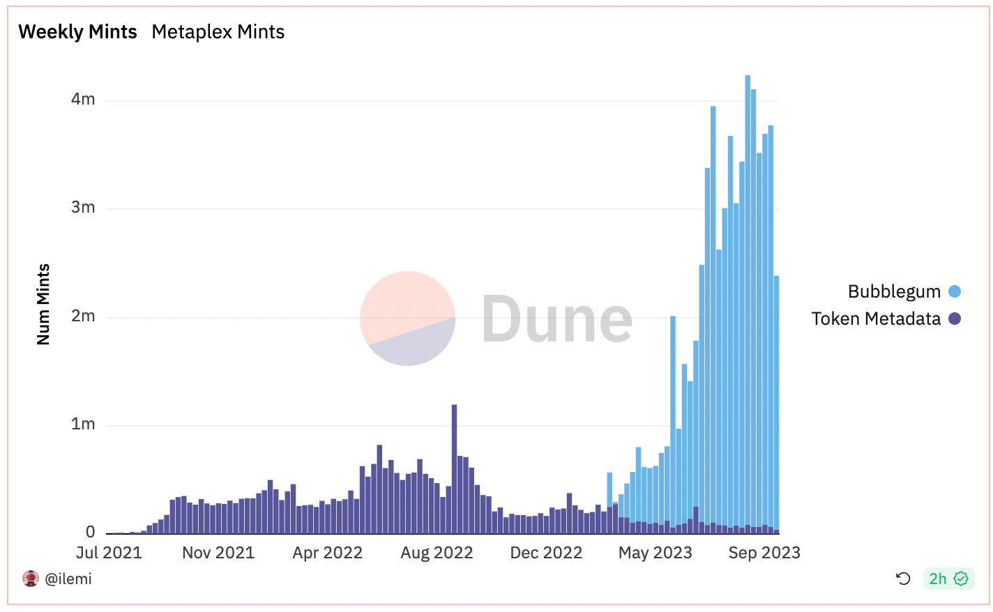 NFT minting volume has taken off due to "compressed NFTs" which allow you to mint 1 million NFTs for approximately $110. This has led to close to 60 million cNFTs minted since March 2023. A lot of this is driven by the Helium network, but also has become more used in communities with collections like Tensorians.